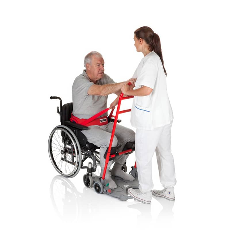 The rising ladder leans forward, away from the user, enabling the user plenty of space to get really close to the assistive device, so as to be able to ”climb” and/or pull himself/herself up while rising to a standing position. The user is also supported by the ladder during standing training and transfer. The design gives plenty of work space for the caregiver, who can remain close and help to support the user from different directions.