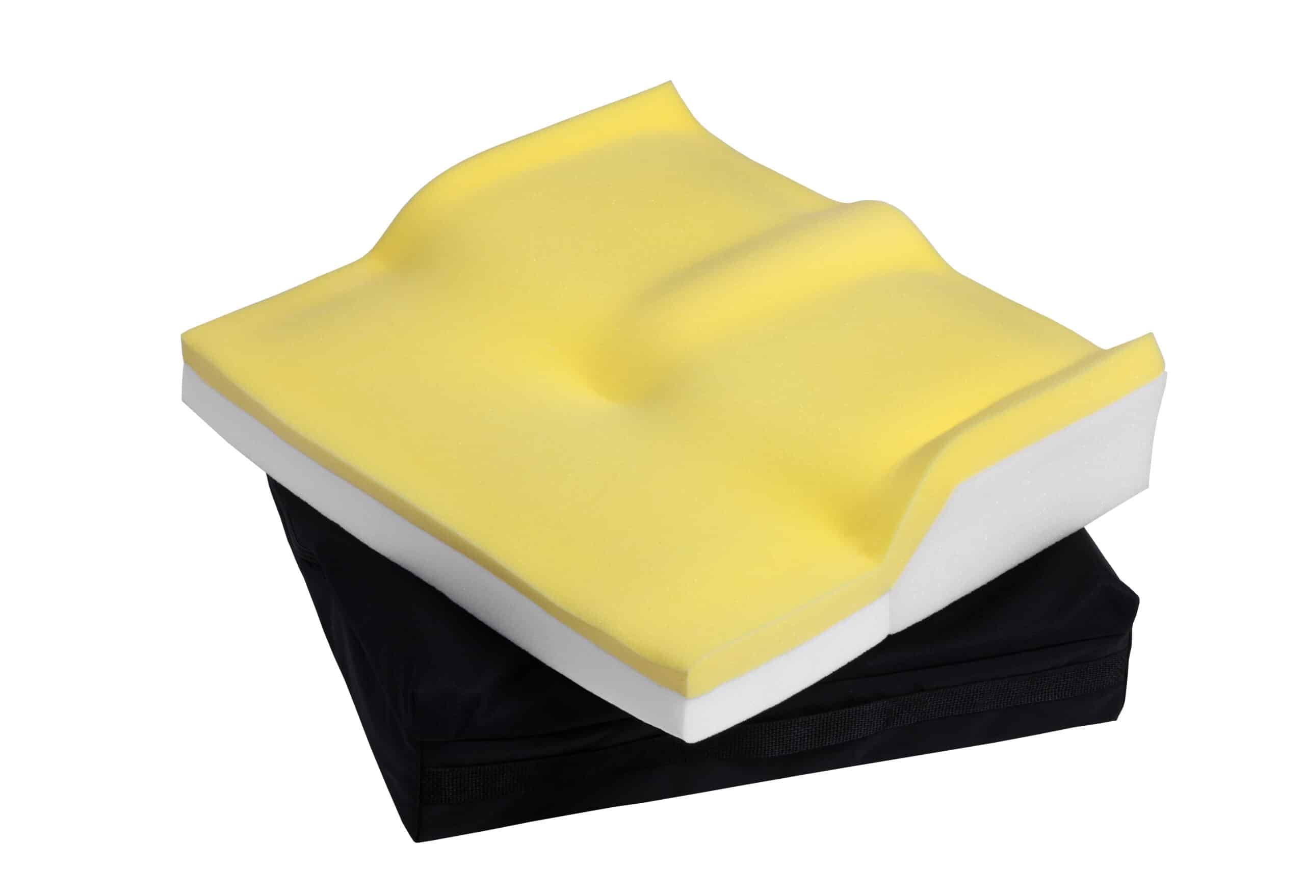 The Equalizer’s multi-component construction features an ultra-comfortable viscoelastic “memory foam” top, a contoured foundation layer for proper positioning of the legs, and an extra soft relief zone for high-risk bony prominences. Three zones of a proprietary, gel-like soft polymer provide added pressure dispersion under the thighs, greater trochanters, and ischial/tailbone region.